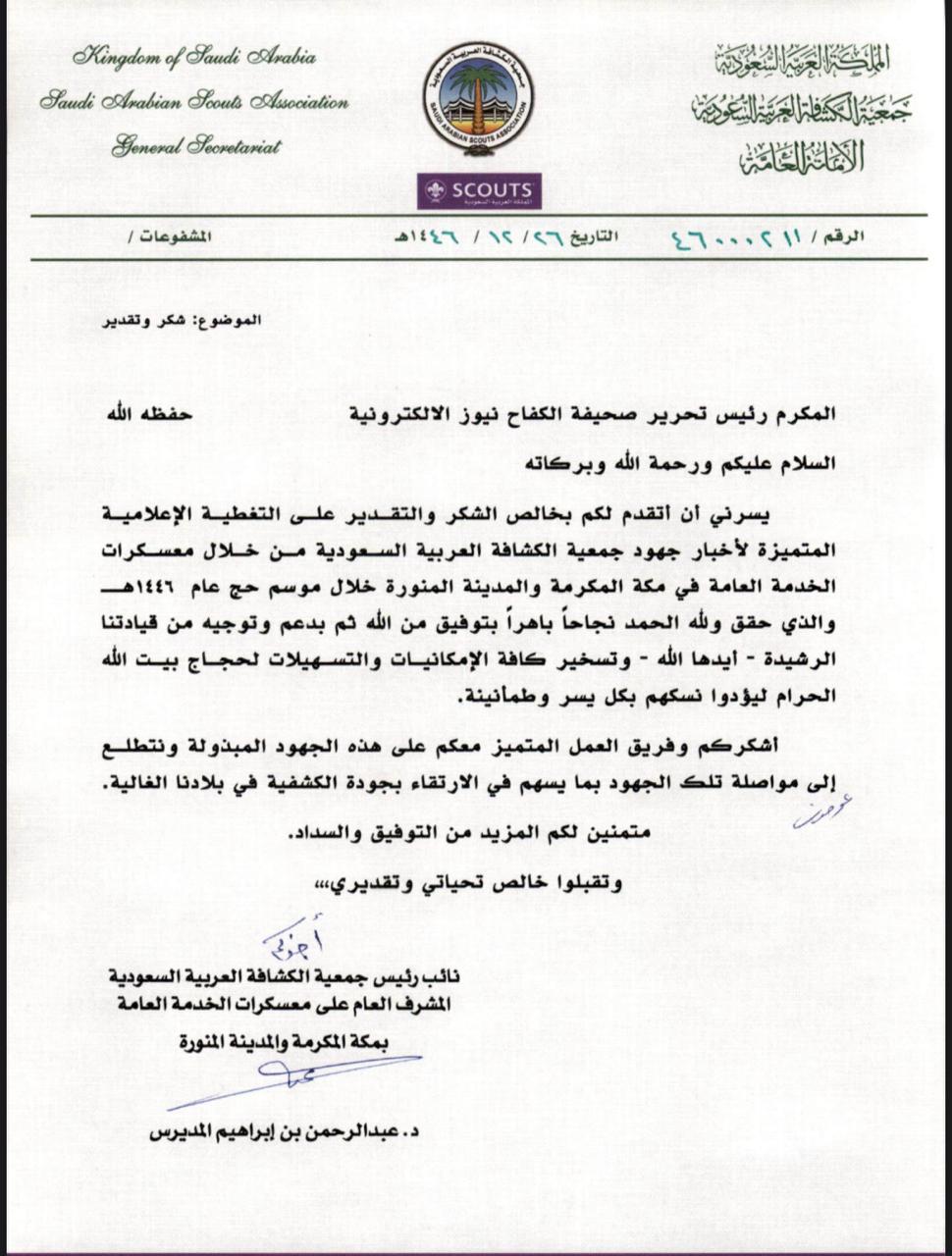 يسرني أن أتقدم لكم بخالص الشكر والتقدير على التغطية الإعلامية المتميزة لأخبار جهود جمعية الكشافة العربية السعودية من خلال معسكرات الخدمة العامة في مكة المكرمة والمدينة المنورة خلال موسم حج عام 1446 والذي حقق ولله الحمد نجاحا باهرا بتوفيق من الله ثم بدعم وتوجيه من قيادتنا الرشيدة أيدها الله وتسخير كافة الإمكانيات والتسهيلات لحجاج بيت الله الحرام ليؤدوا نسكهم بكل يسر وطمأنينة.
