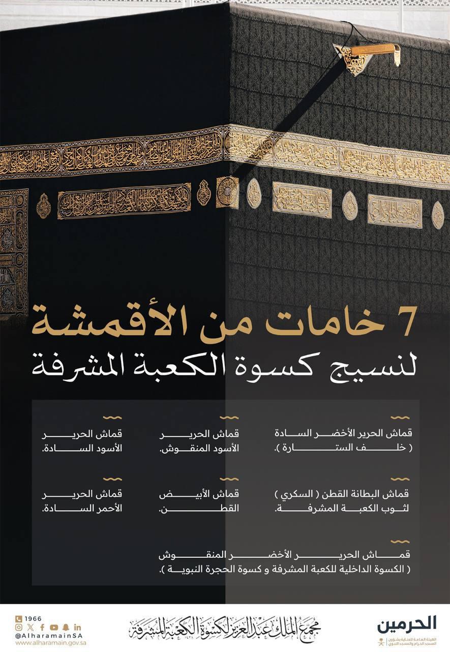 كما أن للكعبة المشرفة مسميات عديدة تعكس مكانتها ، بالإضافة إلى أن هناك 7 خامات فاخرة تُنسج بعناية لصناعة كسوة الكعبة المشرفة ،و في إرثٍ متواصل من العناية يمتد لـ 100 عام.