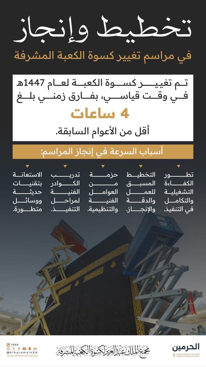 أتمّت الهيئة العامة للعناية بشؤون المسجد الحرام والمسجد النبوي مراسم استبدال كسوة الكعبة المشرفة لهذا العام 1447هـ في وقتٍ قياسي؛ حيث بدأت أعمال التغيير في تمام الساعة 12:00 منتصف ليل الخميس، غرة شهر الله المحرم، وانتهت في تمام الساعة 6:40 صباحًا من اليوم ذاته، محققة بذلك فارق عمل بلغ 4 ساعات عن المدة المعتادة في الأعوام السابقة.