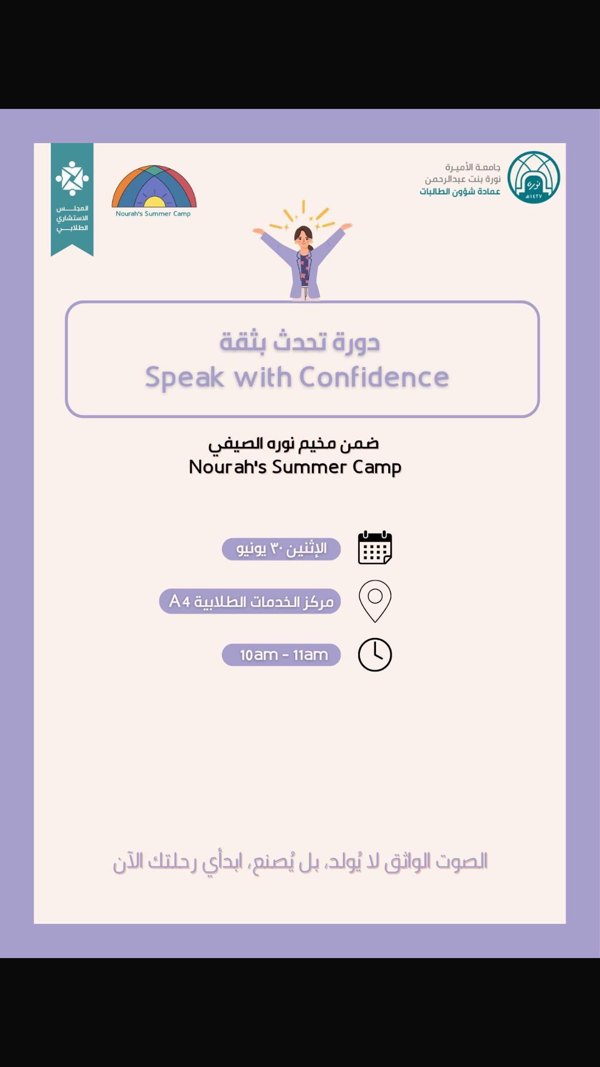 قدمت – الطالبة الإعلامية : شجون علي حدادي إحدى طالبات جامعة الأميرة نوره بنت عبدالرحمن بالعاصمة الرياض مساء اليوم الاثنين 30 يونيو دورة بعنوان ( تحدث بثقة كيف تواجه الجمهور وتخطف الانتباه ) من إعدادها وتقديمها وذلك ضمن برامج الدعم الطلابي والتطوير المهاري ضمن مخيم نورة الصيفي لهذا العام 1447