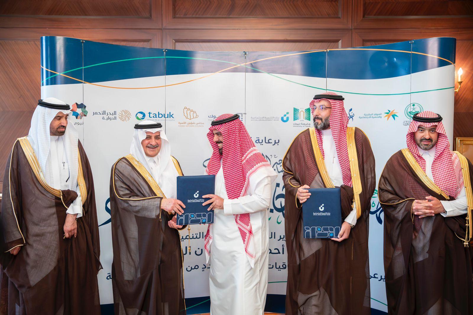 كما رعى سموه توقيع 7 مذكرات تفاهم واتفاقيات إستراتيجية، شملت مذكرة تعاون بين وزارة الموارد البشرية والتنمية الاجتماعية وشركة تبوك للصناعات الدوائية، لدعم مراكز التأهيل الشامل بالأدوية والمستلزمات الطبية، ومذكرة تعاون بين اللجنة الوطنية لرعاية السجناء والمفرج عنهم وأسرهم “تراحم” وجامعة تبوك لتمكين المستفيدين من السجناء المفرج عنهم عبر التدريب والتأهيل المهني، ومذكرة تفاهم بين مجلس شؤون الأسرة وجامعة تبوك لرفع الوعي الأسري وتعزيز أدوارها التربوية والاجتماعية من خلال دراسات ومبادرات موجهة، واتفاقية بين بنك التنمية الاجتماعية وكل من جامعة تبوك وغرفة تبوك وشركة نيوم وشركة البحر الأحمر بهدف دعم وتمكين رواد الأعمال والمنشآت الناشئة والصغيرة والأسر المنتجة، وخلق الوظائف، وتعزيز المساهمة في الناتج المحلي، وإنشاء حاضنات أعمال، ورفع كفاءة المستفيدين من خلال برامج تدريبية.
