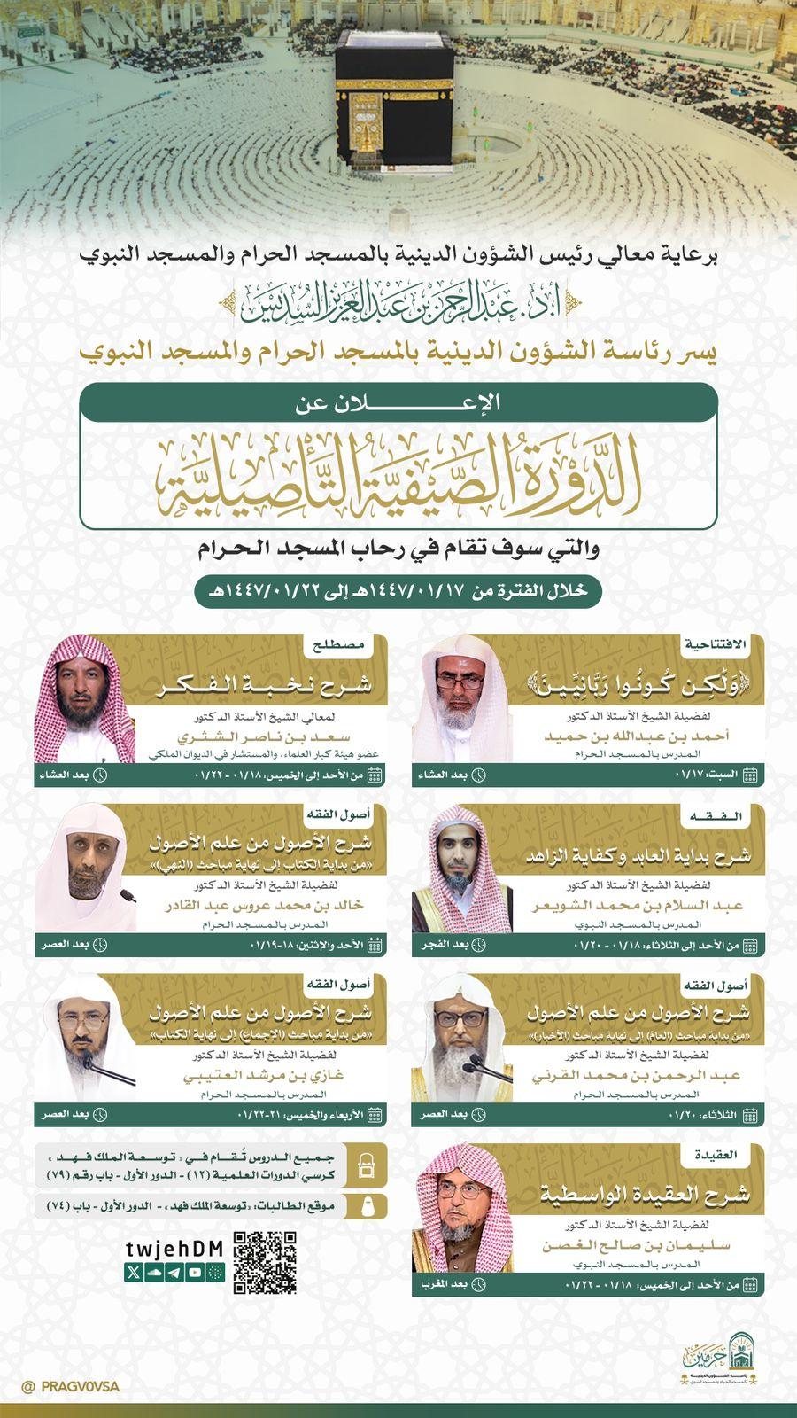 أوضحت رئاسة الشؤون الدينية بالمسجد الحرام والمسجد النبوي، عن إقامة الدورة الصيفية التأصيلية برعاية معالي رئيس الشؤون الدينية الشيخ الأستاذ الدكتور عبدالرحمن السديس، والتي يقدمها عدد من أصحاب المعالي والفضيلة ومدرسي المسجد الحرام.