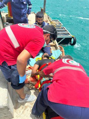 وفور تلقي البلاغ، انطلقت فرقة إسعافية إلى الموقع، حيث تمكّنت الفرقة من الوصول إلى المصاب عبر قارب بحري، وسط ظروف جوية بحرية غير مستقرة تميّزت بتيارات قوية، وسطح مائي متقلب.
