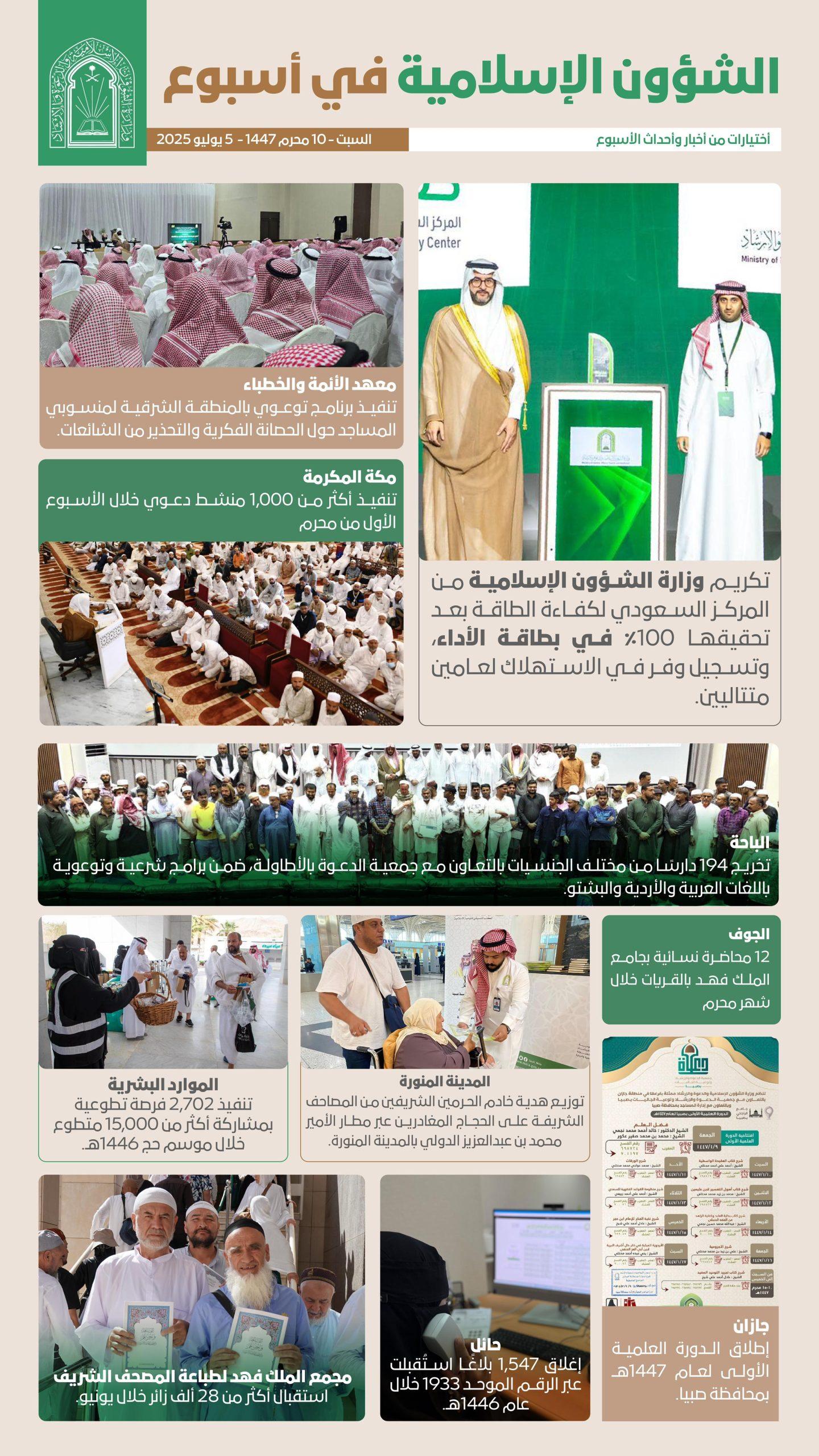 اختيارات من أبرز أخبار وزارة الشؤون الإسلامية خلال أُسبوع، تسلّط الضوءَ على منجزاتها وأعمالها التوعوية والإرشادية والميدانية بمختلف مناطق المملكة.