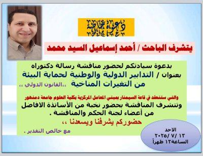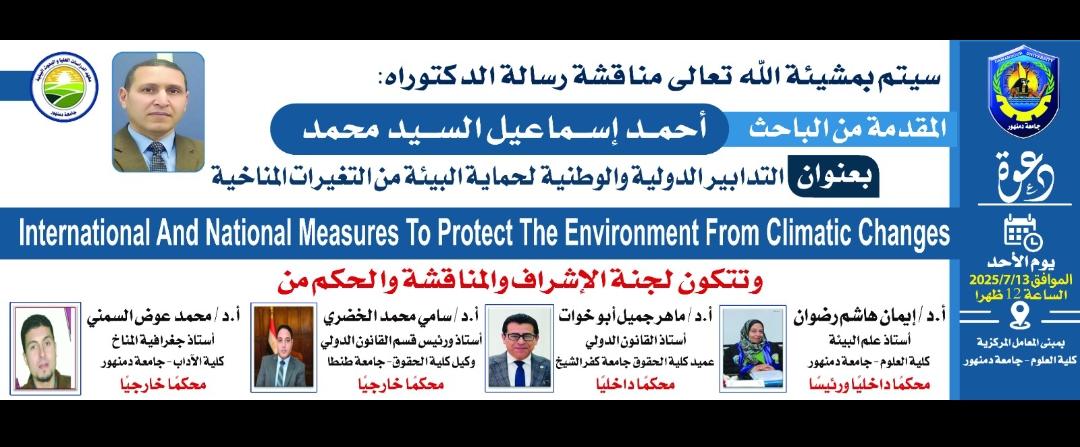 التدابير الدولية والوطنية للحماية من التغييرات المناخية القانون الدولي عنوان رسالة الدكتوراة التى تقدم بھا الباحث احمد اسماعيل السيد مدير ادارة المجالس بديوان عام محافظة كفر الشيخ بجمهورية مصر العربية وتتكون لجنة الإشراف والمناقشة من الأستاذ الدكتور سامى محمد عبد العال السكنى أستاذ القانون الدولي جامعة طنطا الاستاذ الدكتور محمد عوض السكنى أستاذ الجغرافيا المناخية ورئيس قسم الجغرافيا الأسبق جامعة دمنھور المشرفين على الرسالة الأستاذ دكتور إيمان هاشم رضوان أستاذ علم البيئة ــ كلية العلوم جامعة دمنهور الاستاذ الدكتور ماهر جميل أبو خوات أستاذ القانون الدولي وعميد كلية الحقوق جامعة كفر الشيخ مناقشة الرسالة بقاعة السيمينار بمنبى المعامل المركزية بكلية العلوم جامعة دمنهور.