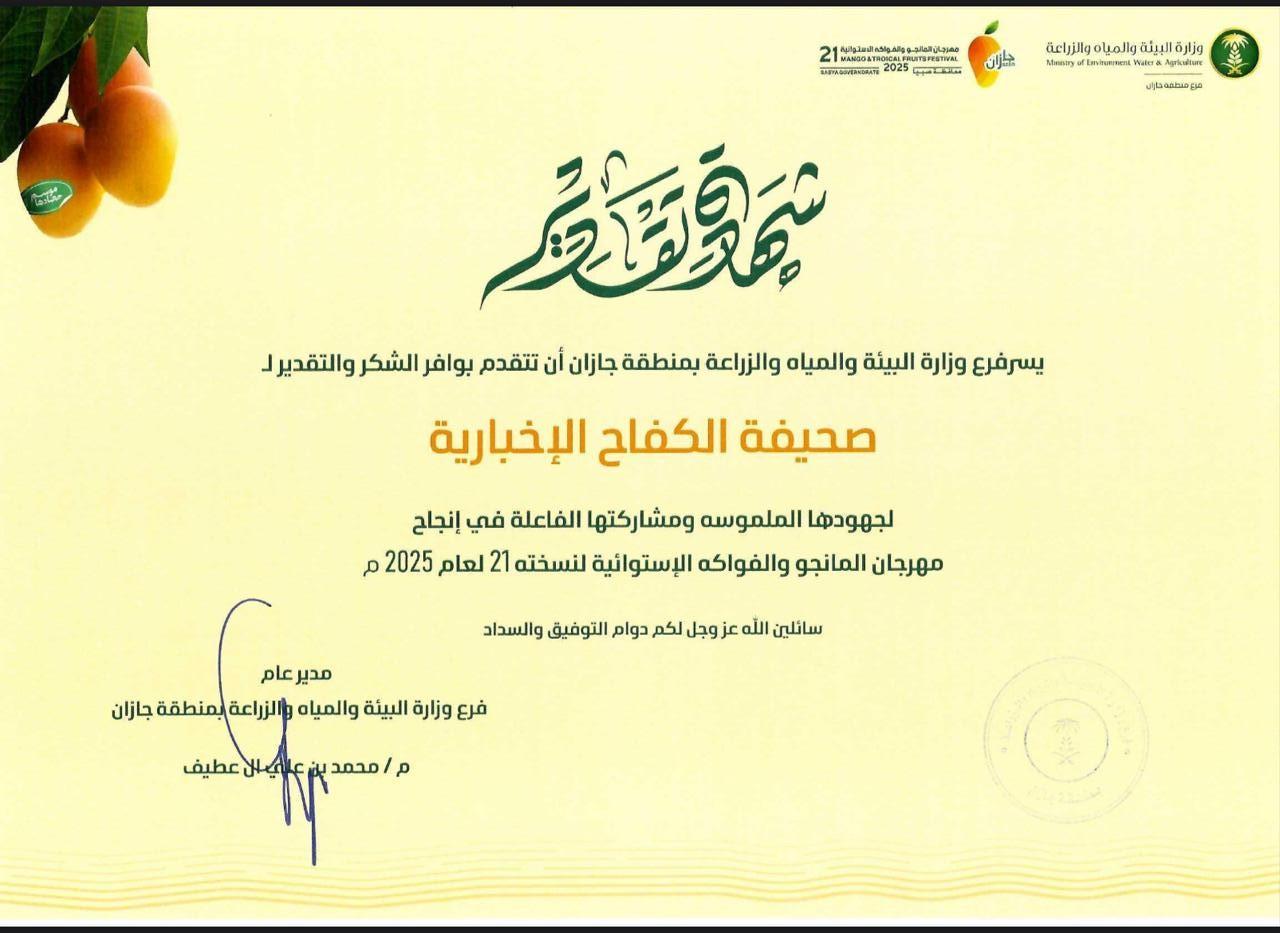 فرع وزارة البيئة والمياه والزراعة بمنطقة جازان تكرم صحيفة الكفاح نيوز لجهودها الملموسة ومشاركتها الفاعلة في إنجاح مهرجان المانجو والفاكهة الإستوائية لنسختها 21 لعام 2025