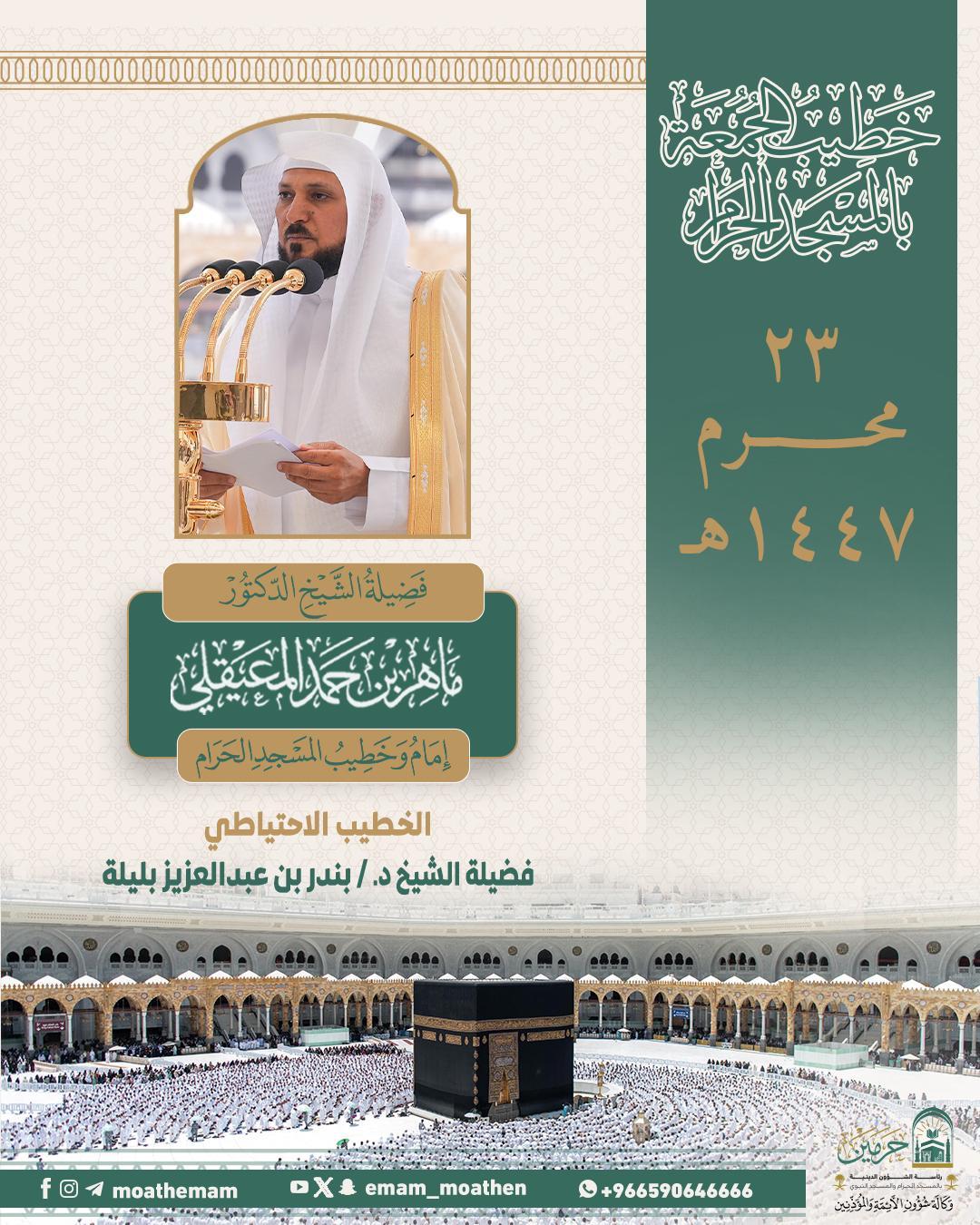 وسيتولى فضيلة الشيخ الدكتور ماهر المعيقلي إمامة المصلين وإلقاء خطبة الجمعة في المسجد الحرام فيما يخطب ويؤم المصلين في المسجد النبوي فضيلة الشيخ الدكتور حسين آل الشيخ وتأتي هذه الترتيبات في إطار جهود رئاسة الشؤون الدينية المستمرة لتنظيم شؤون الإمامة والخطابة، بما يحقق الرسالة الدينية والتوعوية للحرمين الشريفين.