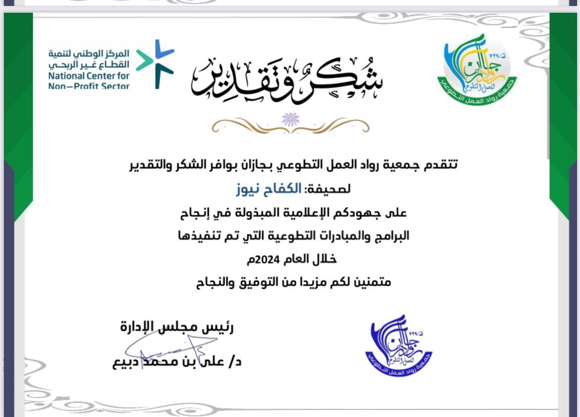تم تكريم صحيفة الكفاح نيوز – من قبل جمعية رواد العمل التطوعي بجازان بشهادة شكر وتقدير على جهود الصحيفة الإعلامية المبذولة في إنجاح البرامج والمبادرات التطوعية التي تم تنفيذها خلال العام 2024 م