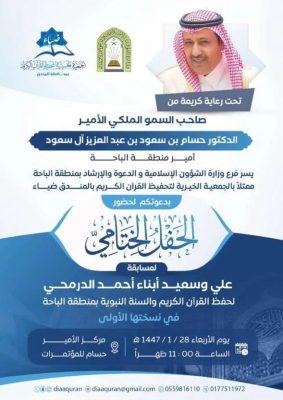 برعاية أمير منطقة الباحة صاحب السمو الملكي الأمير الدكتور حسام بن سعود بن عبد العزيز ال سعود وبحضور وكيل إمارة المنطقة الدكتور عبدالمنعم ياسين الشهري ومدير فرع وزارة الشؤون الاسلامية بمنطقة الباحة الاستاذ نواف الغامدي وعدد من المسؤولين ومحافظي المحافظات ومديري الادارات بالمنطقة نظم فرع وزارة الشؤون الإسلامية والدعوة والارشاد بمنطقة الباحة ممثلا بالجمعية الخيرية لتحفيظ القرآن الكريم بالمندق ضياء الحفل الختامي لمسابقة على وسعيد أبناء أحمد الدرمحي لحفظ القرآن الكريم والسنة النبوية بمنطقة الباحة لعام ١٤٤٦ هـ في نسختها الأولى.