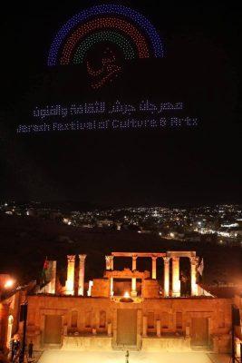 وشهد حفل الافتتاح عروضًا استعراضية بالطائرات (الدرون)، حيث أضاءت سماء جرش لوحات ضوئية جسّدت صور جلالة الملك وولي العهد، وشعار المهرجان، إلى جانب مشاهد فنية رقمية تعكس جمال وعراقة المسارح الأثرية في المدينة الأردنية العريقة.