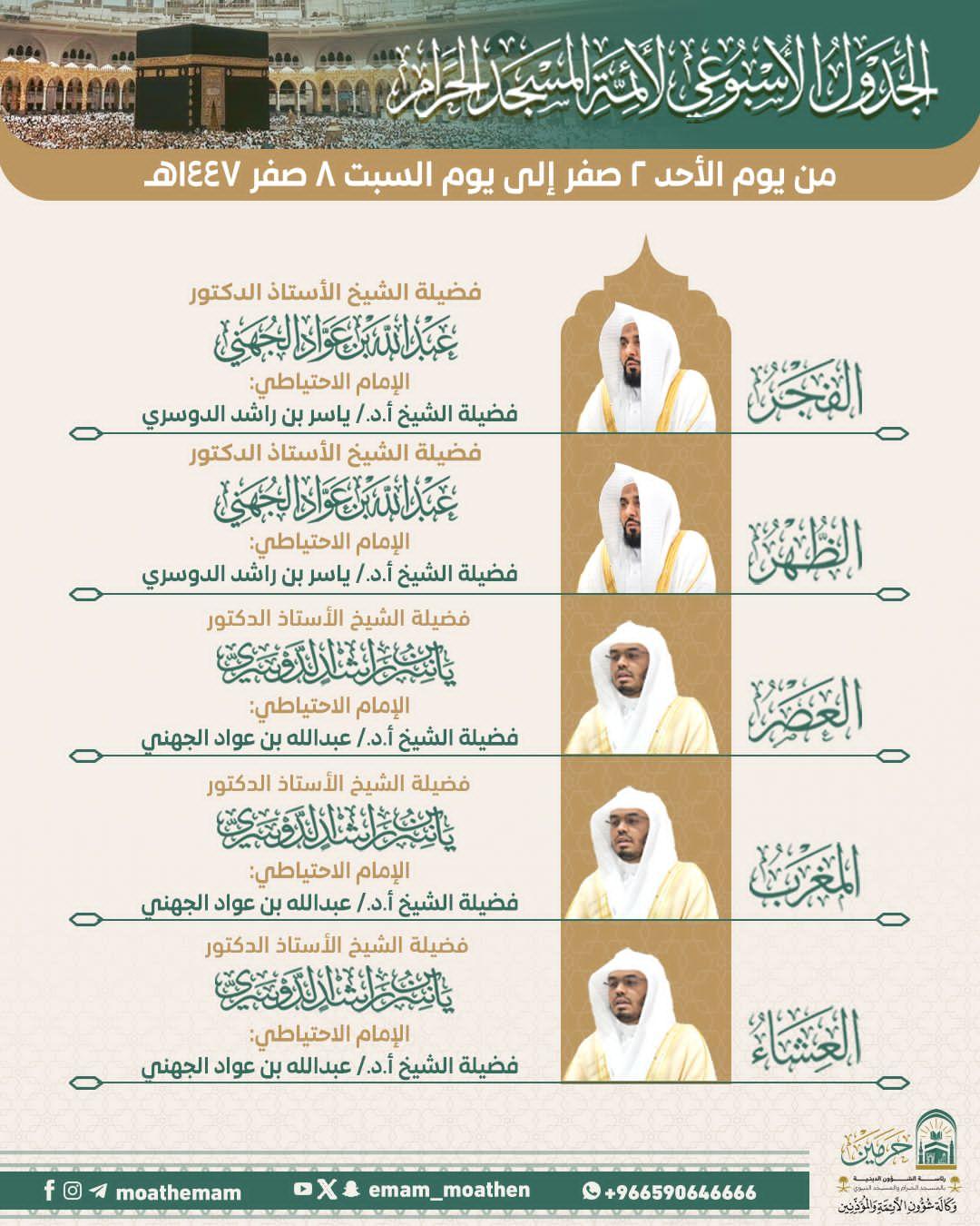أوضحت رئاسة الشؤون الدينية بالمسجد الحرام والمسجد النبوي عن الجدول الأسبوعي لأئمة الحرمين الشريفين للفترة من يوم الأحد 2 صفر حتى السبت 8 صفر 1447هـ، وذلك في إطار حرصها المستمر على تنظيم الشعائر، وتمكين المصلين من أداء صلواتهم في أجواء من الطمأنينة والسكينة وجاء توزيع الأئمة على النحو التالي: