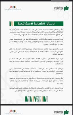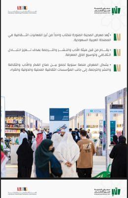 وبين أن المعرض يعزز التبادل الثقافي ويشجع على الاهتمام بالقراءة، ويسلط الضوء على مواهب الكتّاب والأدباء السعوديين، ويعمل على توفير بيئة استثمارية بمعايير عالمية، مشيرًا إلى أن المعرض أصبح اليوم فعالية سنوية مُنتظرة تستقطب آلاف الزوار للاطلاع على أحدث عناوين الكتب وإصداراتها.