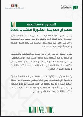 ويقدم المعرض هذا العام تجربة ثقافية غنية ومتنوعة تعكس الحراك الثقافي في المملكة، وتُلبي اهتمامات الزوار على اختلاف شرائحهم وميولهم، من خلال مجموعة واسعة من الإصدارات الحديثة في المجالات الأدبية والمعرفية، والعلمية، بمشاركة عدد من الكيانات الحكومية والمؤسسات الثقافية والمجتمعية، لاستعراض أبرز برامجها ومبادراتها، بالإضافة إلى فرصة لقاء المؤلفين في ركن توقيع الكتب، إلى جانب برنامج ثقافي ثري، يضم عددًا واسعًا من الفعاليات النوعية، تشمل ندوات وجلسات وورش عمل، بمشاركة مجموعة من المثقفين والخبراء، في خطوة تعزز من الحراك الثقافي والأدبي، وتسهم في استقطاب شرائح جديدة نحو معارض الكتاب.