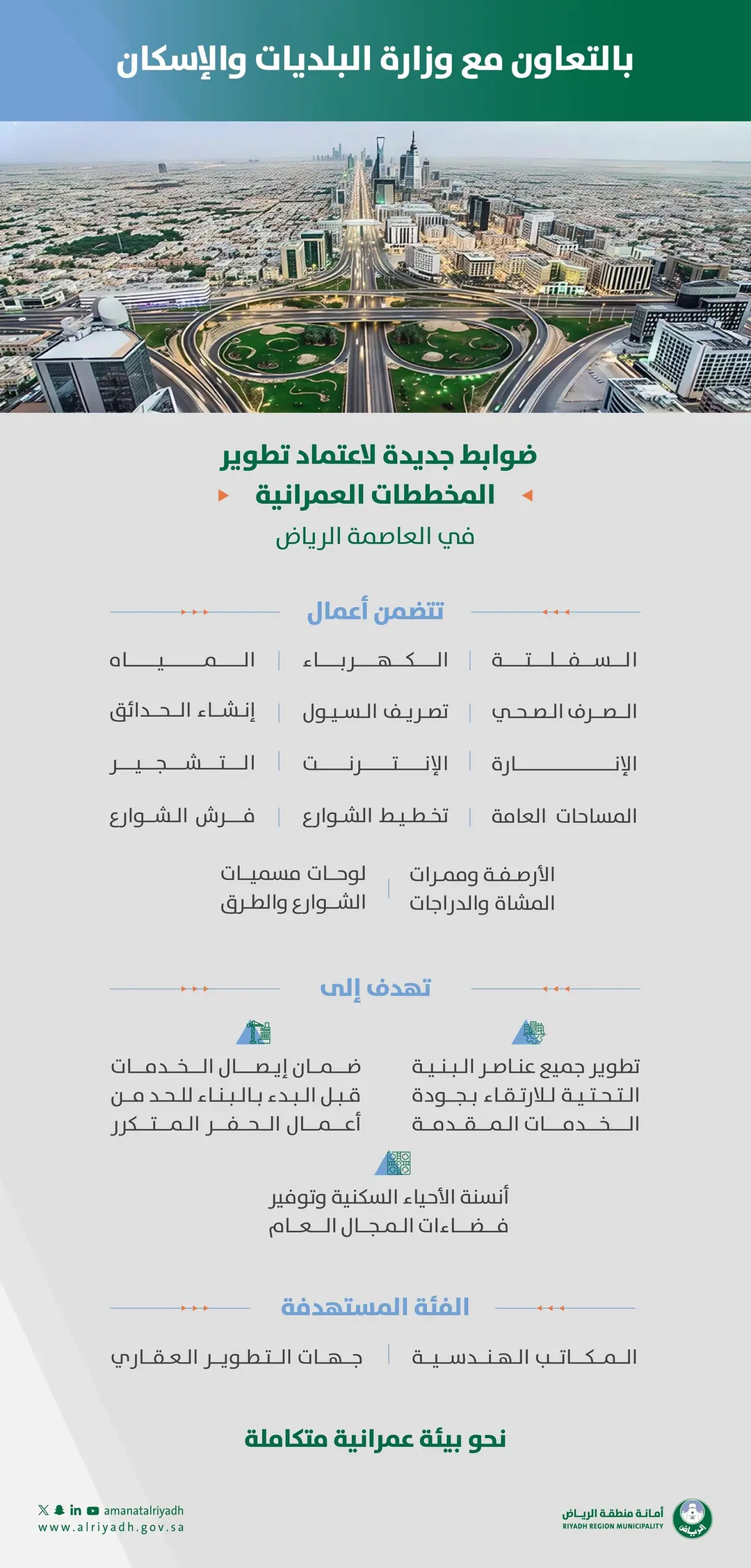 وتشمل الاشتراطات الجديدة تنفيذ أعمال السفلتة والرصف، وإنارة الشوارع، وتمديد شبكات المياه، والصرف الصحي، والكهرباء، والهاتف، إلى جانب استكمال شبكات تصريف السيول، وإنشاء الحدائق، وأعمال التشجير، وتوفير عناصر المجال العام مثل الفراغات المفتوحة، ولوحات تسمية الشوارع، وتخطيط الطرق، وتوفير الأثاث الحضري لتحسين الأماكن العامة، وذلك وفق الأدلة الفنية المعتمدة لدى الأمانة.