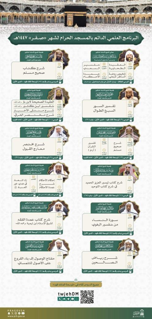أصدرت رئاسة الشؤون الدينية بالمسجد الحرام والمسجد النبوي جدول البرنامج العلمي الدائم في المسجد الحرام، لشهر صفر من العام 1447هـ، وذلك استمرارًا في تعزيز الحضور العلمي والدعوي في أروقة الحرم المكي الشريف.
