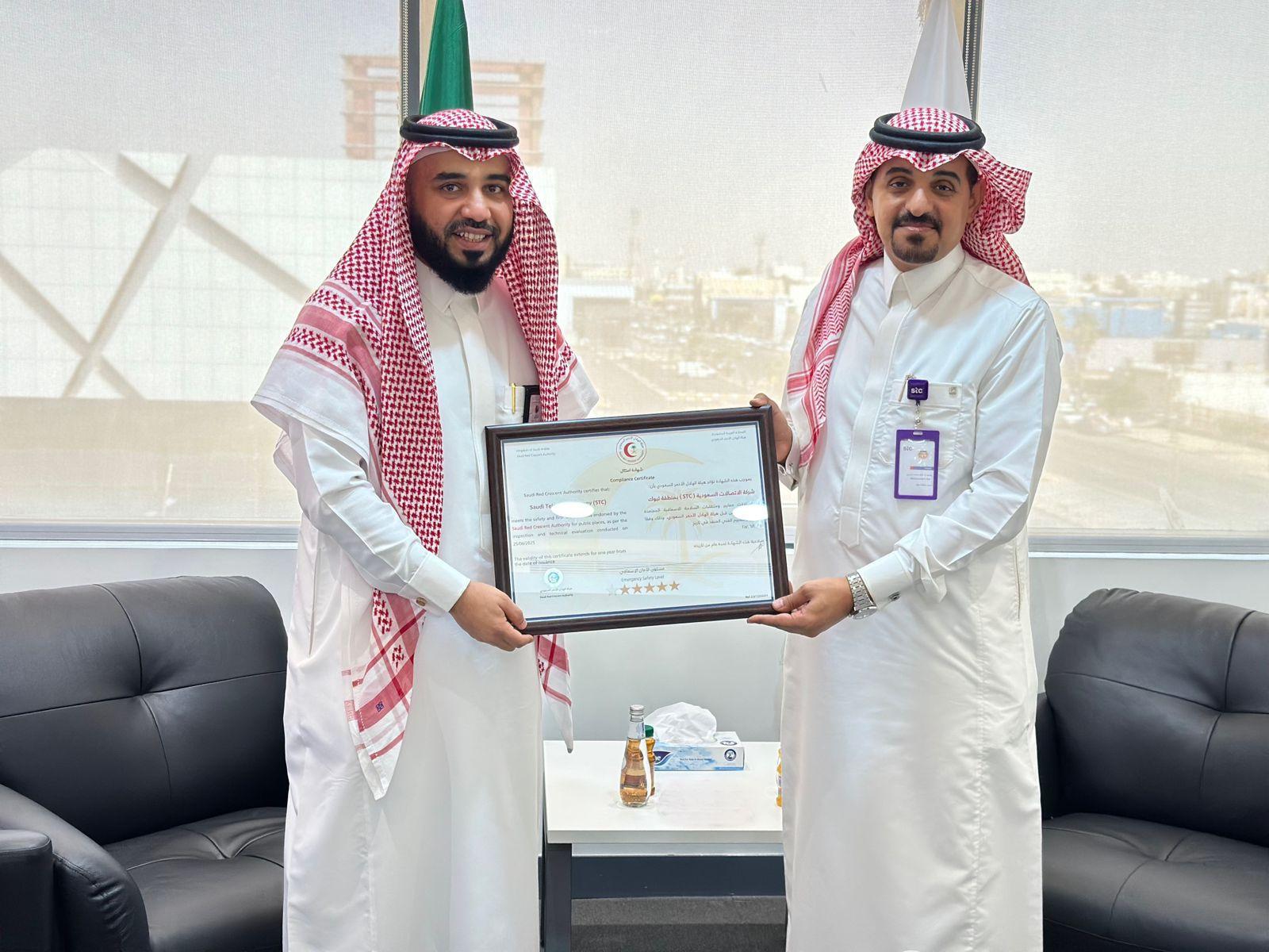 منحت هيئة الهلال الأحمر السعودي الاتصالات السعودية بتبوك شهادة الإمتثال للسلامة الاسعافية، والتي تعنى بتطبيق السلامة الإسعافية في المنشآت وفق المعايير المعتمدة من الهيئة بهدف توفير بيئة عمل آمنة لمنسوبيها وذلك من خلال 3 مسارات تبدأ بتدريب منسوبي الجهة على مهارات الإسعافات الأولية، وتوفير الأدوات والأجهزة الطبية اللازمة والتدريب على أجهزة مزيل الرجفان البطيني (الصدمات القلبية – AED) وكيفية استخدامها، وصولاً لتأمين مسار سريع مخصص لسيارات الإسعاف والذي يساهم في تقليل زمن الاستجابة للحالات الطارئة.
