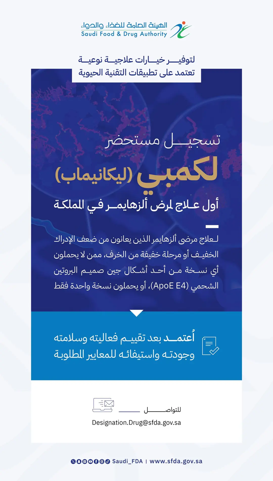 أعلنت الهيئة العامة للغذاء والدواء تسجيل مستحضر لكمبي (ليكانيماب)، لعلاج مرضى ألزهايمر الذين يعانون ضعف الإدراك البسيط أو مرحلة خفيفة من الخرف، ممن لا يحملون أي نسخة أو نسخة واحدة فقط من أحد أشكال جين صميم البروتين الشحمي (ApoE4)‘ إذ يعد أول علاج يُعتمد لمرض ألزهايمر في المملكة.
