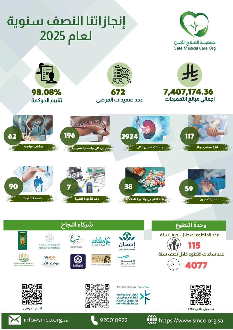 أصدرت جمعية ” العلاج الآمن ” في جدة تقرير إنجازاتها للنصف الأول من عام 2025 ، إذ تضمن عددًا من الأهداف الاستراتيجية التي نفذتها الجمعية، بالإضافة إلى المبادرات والإنجازات التي حققتها، والتي تتعلق بجهودها الخيرية والإنسانية للإسهام في تأمين الخدمات العلاجية للحالات غير المقتدرة، عبر الشراكة مع الجهات ذات العلاقة وفا على الخير.