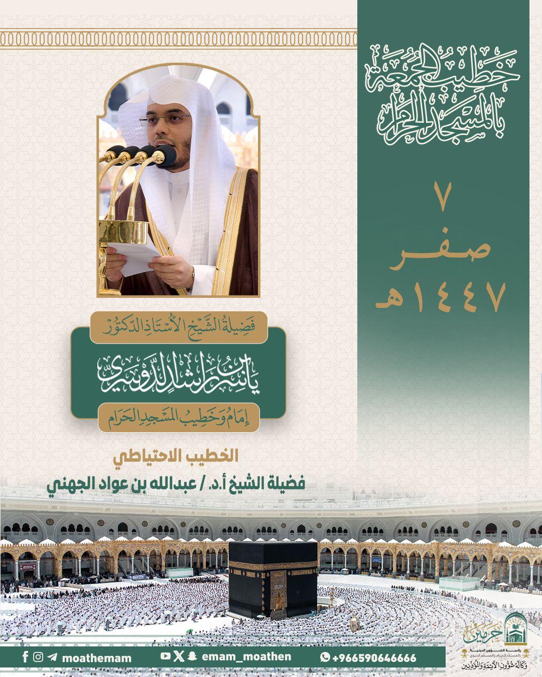 أوضحت رئاسة الشؤون الدينية بالمسجد الحرام والمسجد النبوي، عن أسماء خطيبا وإماما صلاة الجمعة في الحرمين الشريفين ليوم بعد غد الجمعة الموافق 7 صفر 1447هـ وذلك ضمن جدولها الدوري لتنظيم الإمامة والخطابة.