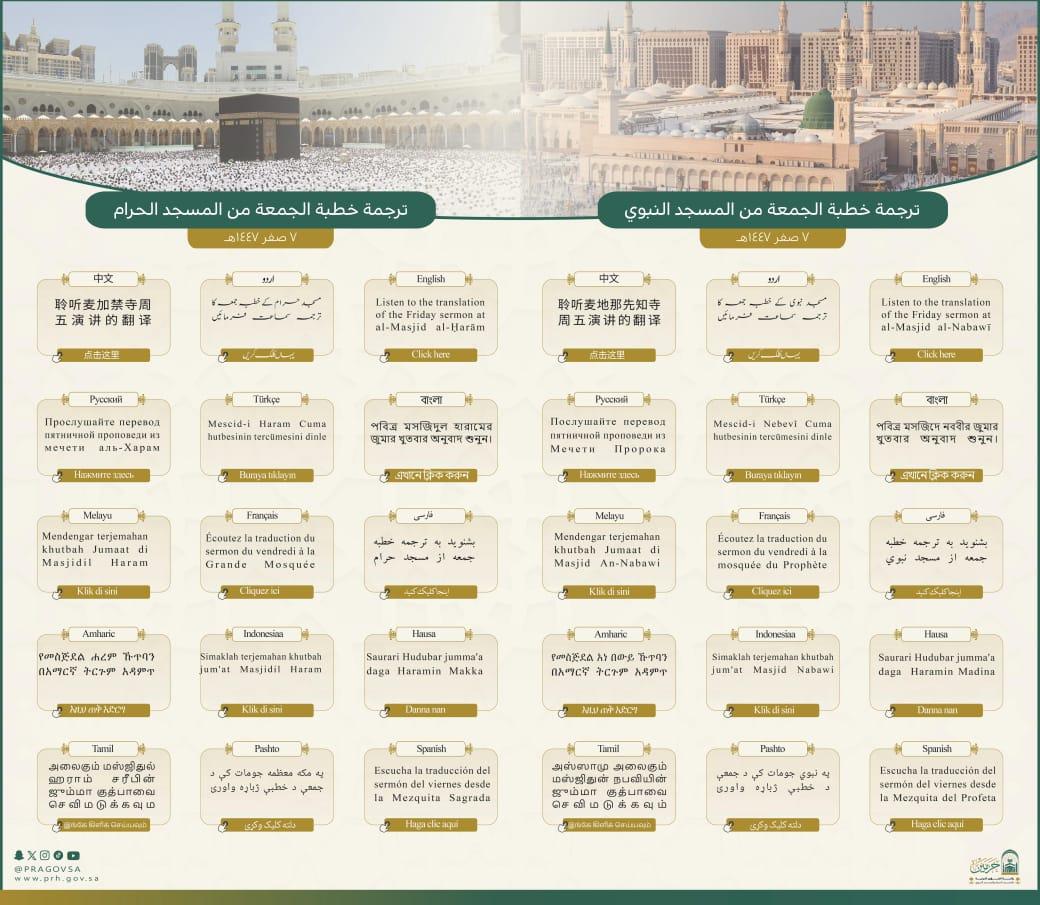 وأكدت الرئاسة حرص معالي رئيس الشؤون الدينية، الشيخ الدكتور عبدالرحمن بن عبدالعزيز السديس، على ترجمة خطب الجمعة إلى عدة لغات لتكون جسرًا ممتدًا للتواصل بين الشعوب، وتعزيزًا لتبادل الثقافات والحضارات. وتُعدّ ترجمة خطبة الجمعة من المنطلقات الاستراتيجية لرئاسة الشؤون الدينية لخدمة الزائرين والقاصدين دينيًا بلغاتهم المتنوعة. وتأتي هذه المبادرة في إطار الخطة التشغيلية لموسم العمرة لعام 1447هـ؛ لنشر الهداية، وترسيخ القيم الوسطية، وتسخير التقنيات الحديثة لخدمة قاصدي الحرمين الشريفين. البث https://www.youtube.com/@PRAGOVSA/streams