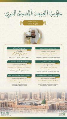 وسيتولى فضيلة الشيخ الدكتور أسامة خياط المصلين وإلقاء خطبة الجمعة في المسجد الحرام فيما يخطب ويؤم المصلين في المسجد النبوي فضيلة الشيخ الدكتور عبدالباري الثبيتي.