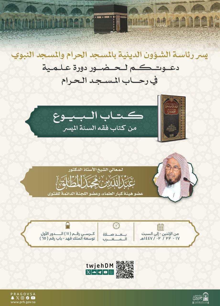 تقيم رئاسة الشؤون الدينية بالمسجد الحرام والمسجد النبوي دورة علمية في رحاب المسجد الحرام، يقدمها معالي الشيخ الأستاذ الدكتور عبدالله بن محمد المطلق، عضو هيئة كبار العلماء، وذلك في شرح كتاب البيوع من “فقه السنة الميسر”.