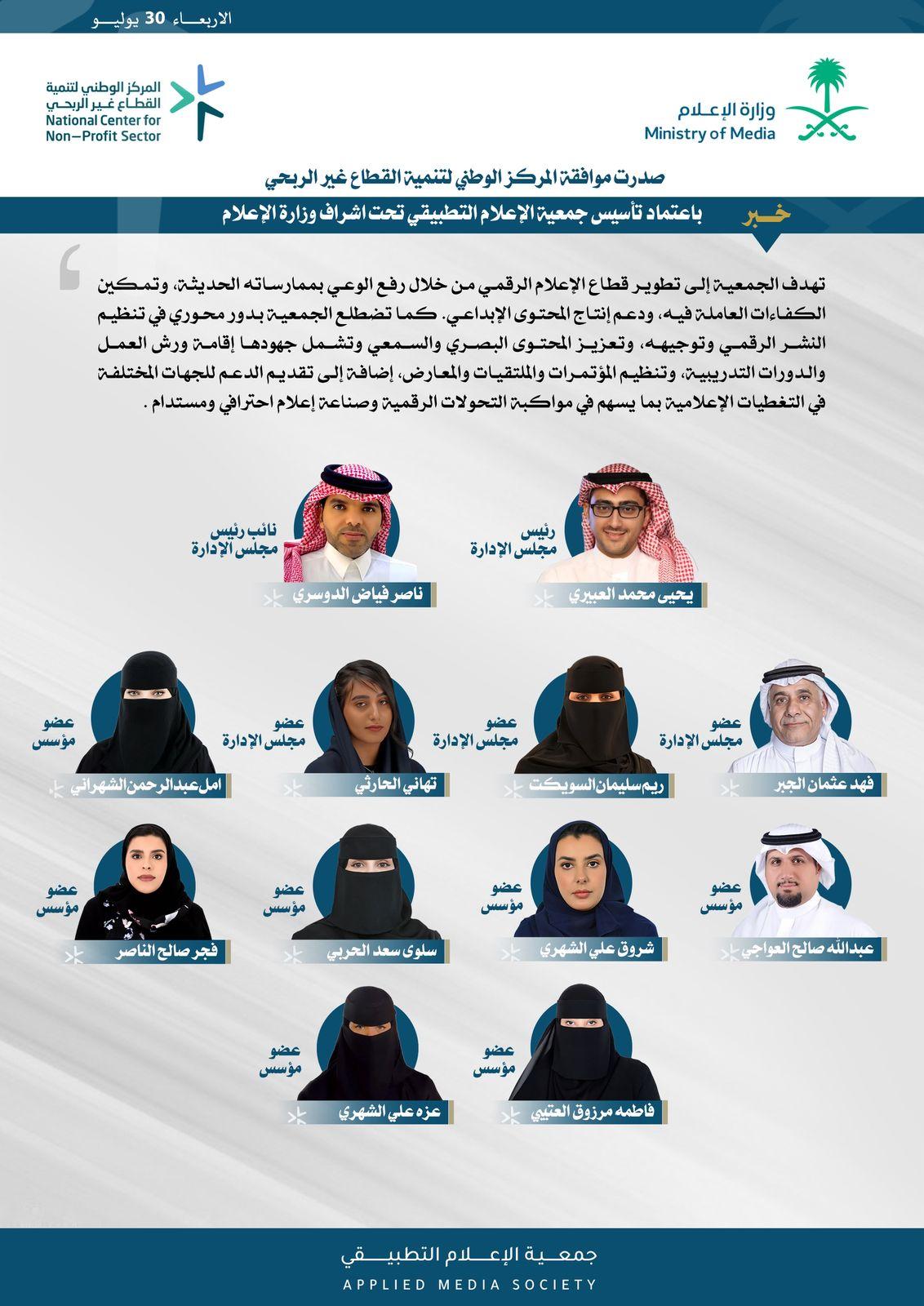 صدرت موافقة المركز الوطني لتنمية القطاع غير الربحي على تأسيس جمعية الإعلام التطبيقي، لتكون تحت إشراف وزارة الإعلام، برئاسة الأستاذ يحيى عبيري، بعد رحلة عمل وجهود امتدت لسنوات، تكللت بتأسيس هذا الكيان المهني الوطني.