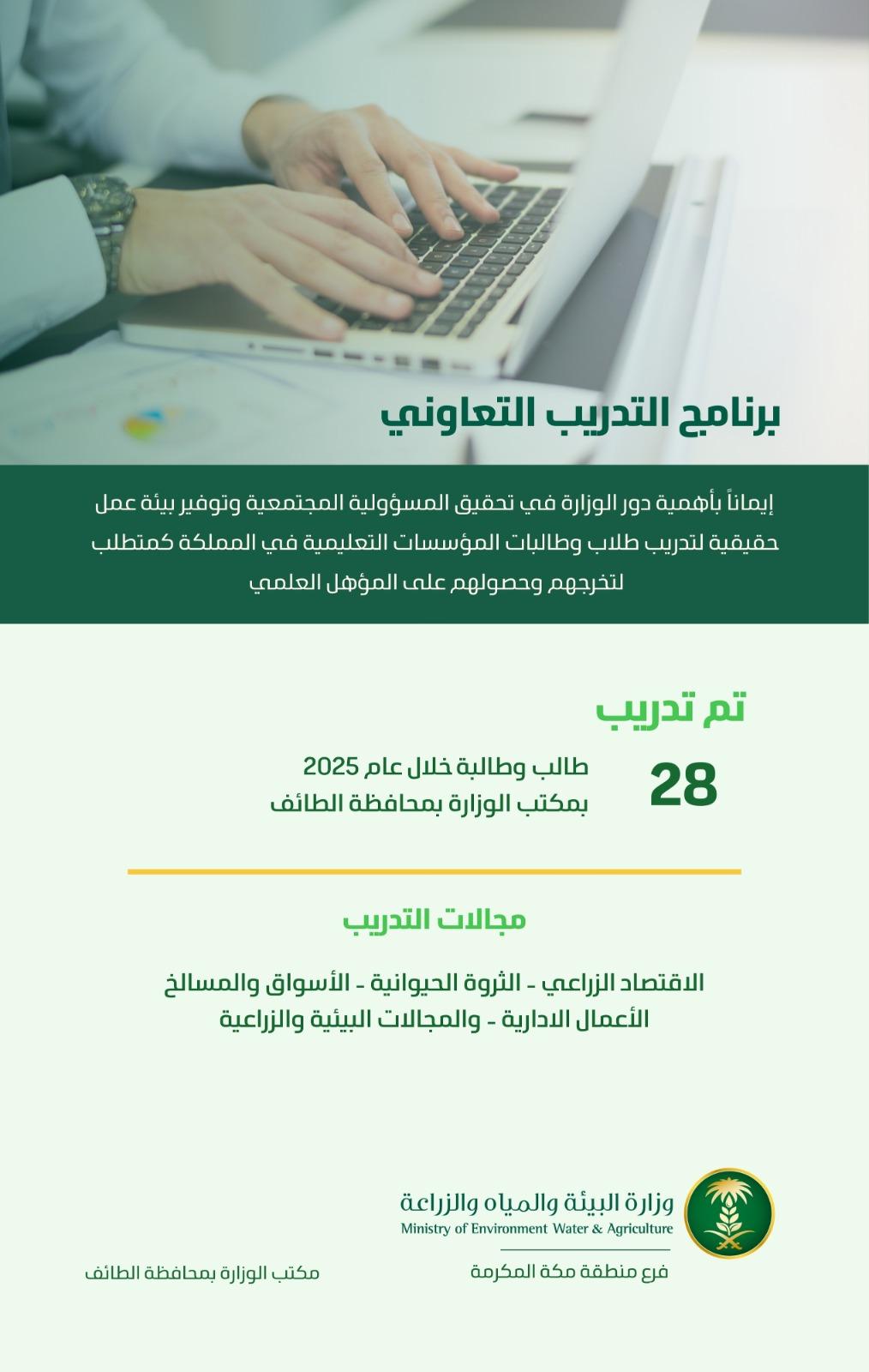 أختتم مكتب وزارة البيئة والمياه والزراعة بمحافظة الطائف أعمال برنامج التدريب التعاوني لعام 2025، الذي أستهدف تدريب 28 طالبًا وطالبة من مختلف الجامعات والمعاهد، بهدف تزويدهم بالخبرة الميدانية وصقل مهاراتهم العملية في مجالات متعددة.