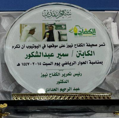 في نهاية اللقاء تم تكريم الكابتن سمير بدرع تذكاري.