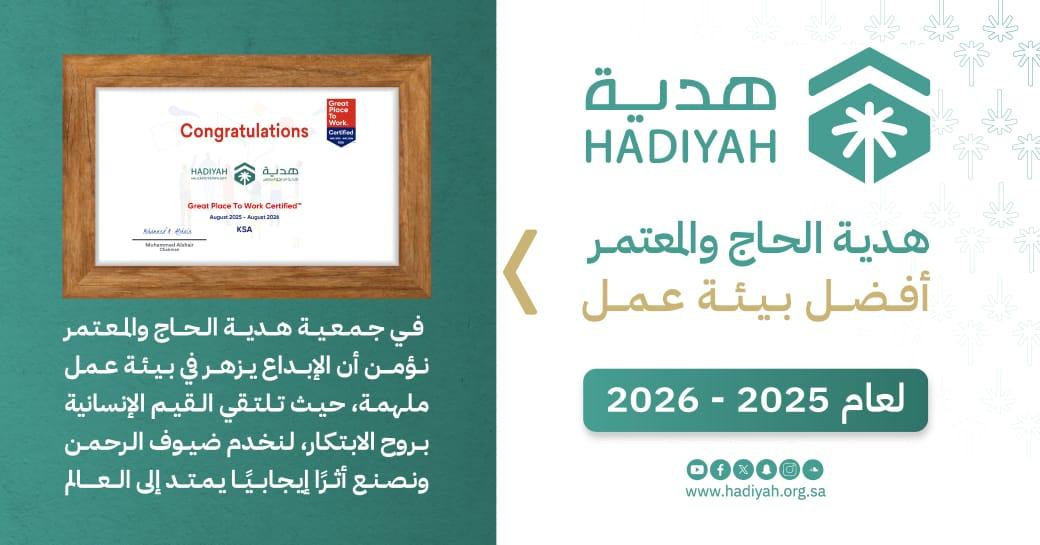 حصلت جمعية هدية الحاج والمعتمر على شهادة أفضل بيئة عمل لعام 2025 – 2026، وهي شهادة اعتراف دولية تمنحها منظمة “Great Place To Work” للجهات التي توفر بيئة عمل متميزة لموظفيها، ويأتي هذا الإنجاز تأكيدًا على التزام الجمعية بتهيئة بيئة عمل مُلهِمة، تجمع بين القيم الإنسانية وروح الابتكار، لخدمة ضيوف الرحمن وتحقيق أثر إيجابي يمتد إلى العالم.