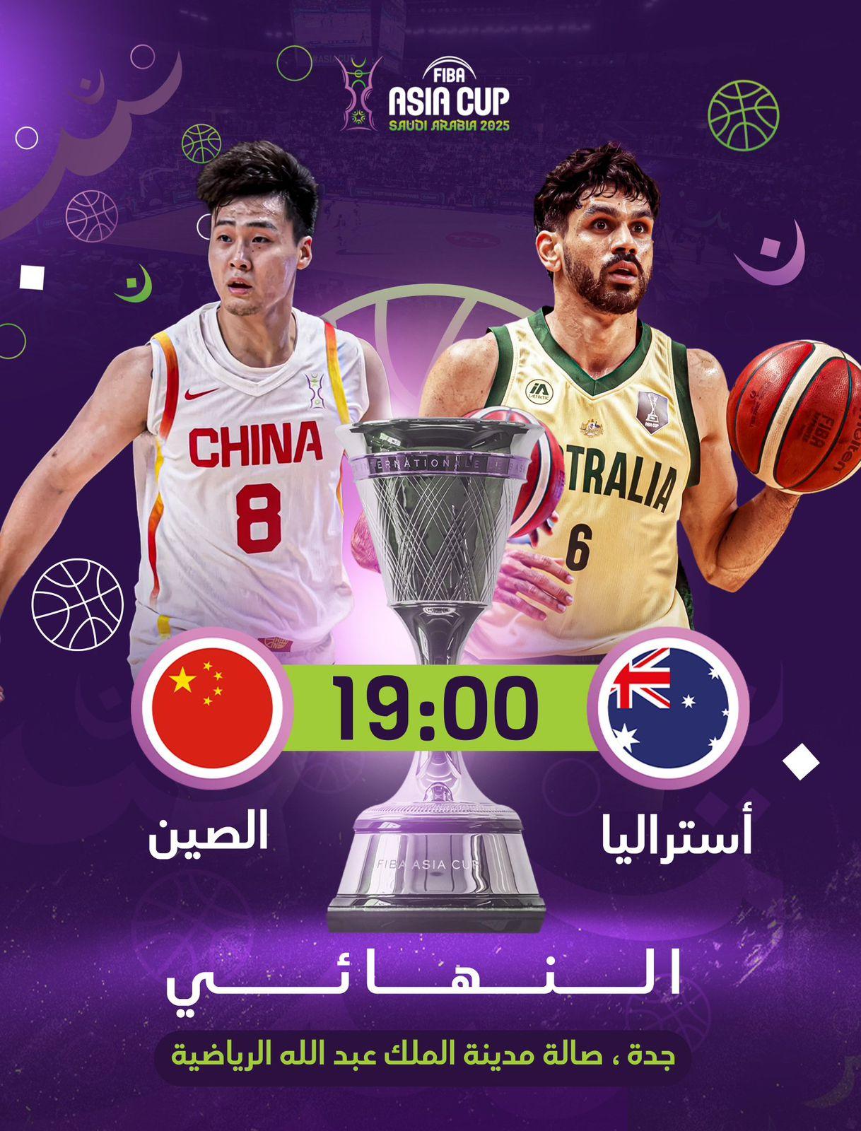 مساء اليوم الأحد ختام كأس أمم آسيا لمنتخبات السلة في جدة 2025 على صالة مدينة عبدالله الرياضية عند الساعة السابعة من مساء اليوم تجمع منتخب الصين ومنتخب استراليا.