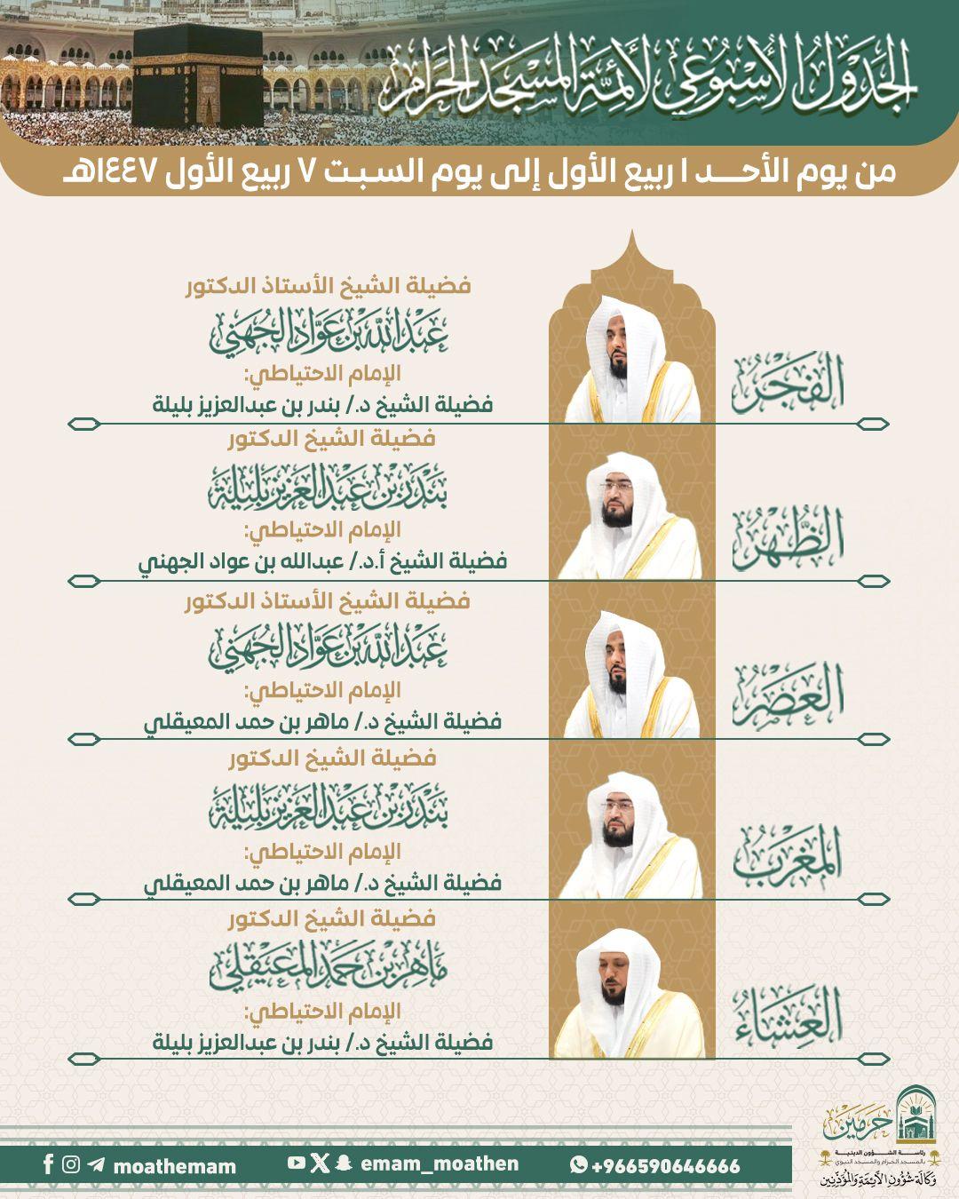 أوضحت رئاسة الشؤون الدينية بالمسجد الحرام والمسجد النبوي عن الجدول الأسبوعي لأئمة الحرمين الشريفين للفترة من يوم غد الأحد الأول من شهر ربيع الأول حتى يوم السبت القادم السابع من شهر ربيع الأول 1447هـ، وذلك في إطار حرصها المستمر على تنظيم الشعائر وتمكين المصلين من أداء صلواتهم في أجواء مفعمة بالطمأنينة والسكينة.
