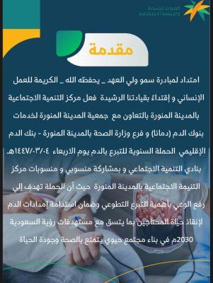 فعل مركز التنمية الاجتماعية بالمدينة المنورة بالتعاون مع جمعية المدينة المنورة لخدمات بنوك الدم ( دمانا) وفرع وزارة الصحة بالمدينة المنورة بنك الدم الإقليمي الحملة السنوية للتبرع بالدم الأربعاء الماضي 4-3-1447 بنادي التنمية الاجتماعية وبمشاركة منسوبي ومنسوبات مركز التنمية الاجتماعية بالمدينة المنورة.