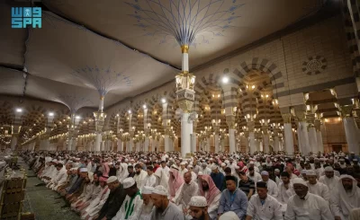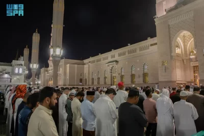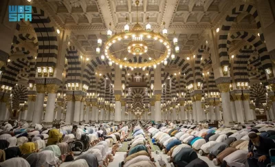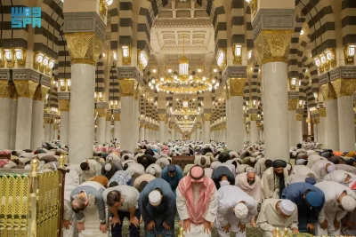 أدّى جموع المصلين في المسجد النبوي بالمدينة المنورة الليلة، صلاة الخسوف، اقتداءً بسنة النبي محمد- صلى الله عليه وسلم-، حيث اكتظّت أروقة المسجد وساحاته بالمصلين من الأهالي والمقيمين وزوار مدينة المصطفى- صلى الله عليه وسلم-.