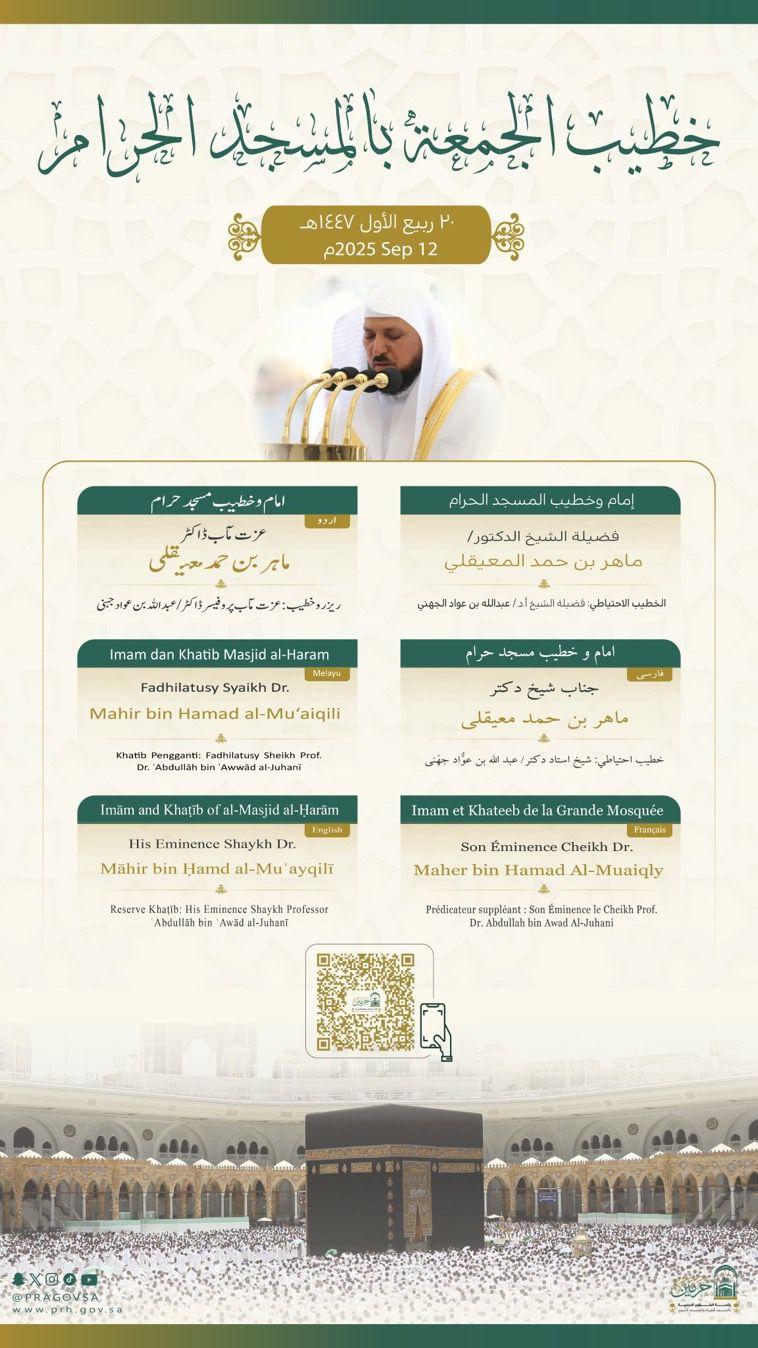 وسيتولى فضيلة الشيخ الدكتور ماهر بن حمد المعيقلي إمامة المصلين وإلقاء خطبة الجمعة في المسجد الحرام فيما يخطب ويؤم المصلين في المسجد النبوي فضيلة الشيخ الدكتور حسين بن عبدالعزيز آل الشيخ وتأتي هذه الترتيبات في إطار جهود رئاسة الشؤون الدينية المستمرة لتنظيم شؤون الإمامة والخطابة، بما يحقق الرسالة الدينية والتوعوية للحرمين الشريفين.