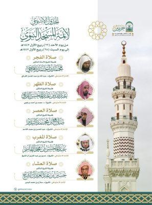 أصدرت الشؤون الدينية بالمسجد الحرام والمسجد النبوي الجدول الأسبوعي لأئمة المسجد الحرام والمسجد النبوي من يوم غد الأحد ٢٢ ربيع الأول إلى يوم السبت القادم ٢٨ ربيع الأول ١٤٤٧هـ
