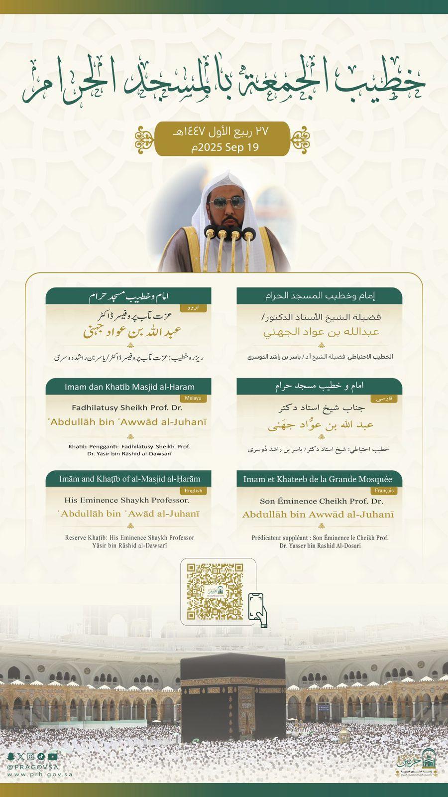 وسيتولى فضيلة الشيخ الأستاذ الدكتور عبدالله الجهني إمامة المصلين وإلقاء خطبة الجمعة في المسجد الحرام فيما يخطب ويؤم المصلين في المسجد النبوي فضيلة الشيخ الدكتور عبدالمحسن القاسم.