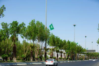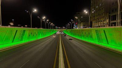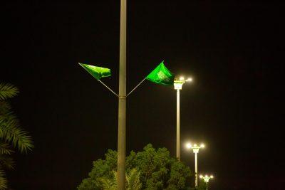 وأوضحت الأمانة أنها أكملت تنفيذ مظاهر الاحتفاء في الطرق والحدائق والميادين، حيث توشحت مدينة تبوك ومحافظاتها ومراكزها بـ 8000 علم وأكثر من 65,476 مترًا طوليًا من أساور الزينة الخضراء على أعمدة الإنارة والأشجار، إلى جانب تشغيل 250 كشافًا ثابتًا لإنارة الجسور والأنفاق باللون والأخضر، كما تم نشر عبارات التهنئة والتبريكات بهذه المناسبة عبر أكثر من 40 شاشة ولافتة طرق.
