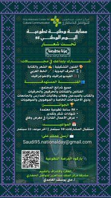 أعلن مركز الملك عبدالعزيز للتواصل الحضاري قبل شهر من موعد الاحتفاء باليوم الوطني الخامس والتسعون بعنوان عزنا بطبعنا عبر مواقع التواصل الاجتماعي والتي ركزت في مضمونها على استقطاب جميع شرائح المجتمع في منطقة المدينة المنورة من الفنانين والفنانات والحرفيين والحرفيات والكتاب والمبدعين وطلاب وطالبات المدارس والجامعات وذوي الاحتياجات الخاصة والموهوبين والموهوبات عبر فرصة تطوعية معتمدة بخمسين ساعة تطوعية عبر المنصة الوطنية للتطوع دعت المسابقة للمشاركة بإبداعات وطنية في مجال الفنون التشكيلية والشعر والكتابة والحرف اليدوية وفنون الخط العربي والفيديو جرافيك والإنفوجرافيك.