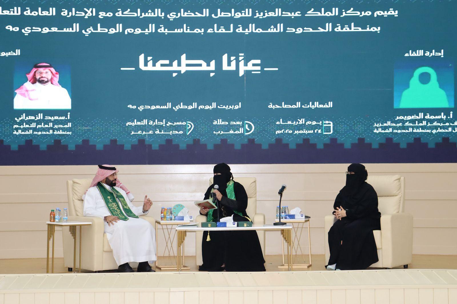 نظّم مركز الملك عبد العزيز للتواصل الحضاري بالشراكة مع إدارة التعليم بمنطقة الحدود الشمالية، مساء اليوم، لقاءً حوارياً بمناسبة اليوم الوطني السعودي الـ95، وذلك على مسرح إدارة التعليم بمدينة عرعر.