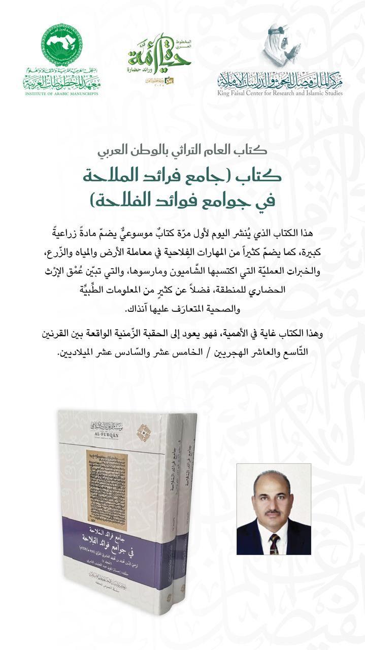 جامع فرائد الملاحة في جوامع فوائد الفلاحة موسوعة زراعية من القرن التاسع الهجري اختير كتاب “جامع فرائد الملاحة في جوامع فوائد الفلاحة”، بتحقيق الأستاذ الدكتور إحسان ذنون الثامري (العراق)، ليكون كتاب العام التراثي بالوطن العربي في احتفالية يوم المخطوط العربي لهذا العام، تقديرًا لقيمته العلمية وما يحمله من معارف زراعية وصحية تعكس ثراء التراث العربي المخطوط.