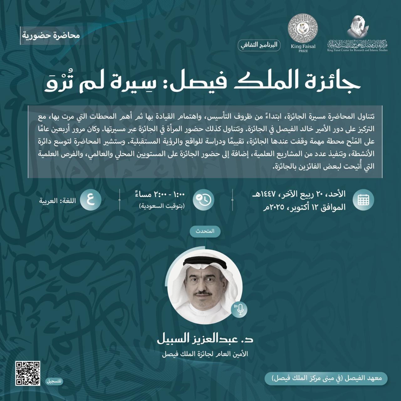 يُنظّم مركز الملك فيصل للبحوث والدراسات الإسلامية ضمن برامج المركز الثقافي، وبالتعاون مع جائزة الملك فيصل، محاضرة حضورية بعنوان” جائزة الملك فيصل: سيرة لم تُرْوَ”، يقدمها سعادة الدكتور عبدالعزيز السبيّل، الأمين العام لجائزة الملك فيصل، وذلك يوم الأحد 12 أكتوبر 2025، في معهد الفيصل بمبنى مركز الملك فيصل للبحوث والدراسات الإسلامية بالرياض، في تمام الساعة الواحدة مساءً.