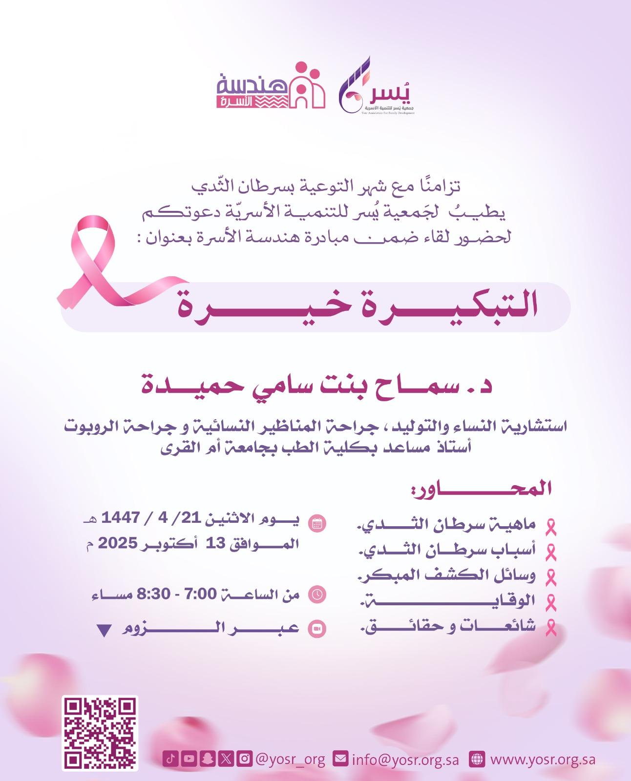 تزامنًا مع الشهر العالمي للتوعية بسرطان الثدي نظمت َجمعية يُسر للتنمية الأسريّة بمكة المكرمة لقاء ضمن مبادرة هندسة الأسرة بعنوان : ( التبكيرة خيرة ).