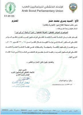 تلقت صحيفة الكفاح نيوز الإلكترونية بالمملكة العربية السعودية خطاب دعوة خاصة بأسم رئيس التحرير الدكتور – عبدالرحيم الحدادي وبأسم الصحيفة من الأستاذ – فيصل خزيم العنزي الأمين العام للاتحاد الكشفي للبرلمانيين العرب لحضور وتغطيات فعاليات المؤتمر الكشفي تحت عنوان ( الحركة الكشفية لمن – ولماذا – و إلى أين ) كما تلقى الأستاذ – السيد يسري محمد عنتر مدير مكتب صحيفة الكفاح نيوز في القاهرة بخطاب مماثل بأسمة وبأسم الصحيفة لحضور الملتقى الكشفي الذي يُقام في دولة الكويت خلال الفترة من 18 إلى 22 أكتوبر الجاري.