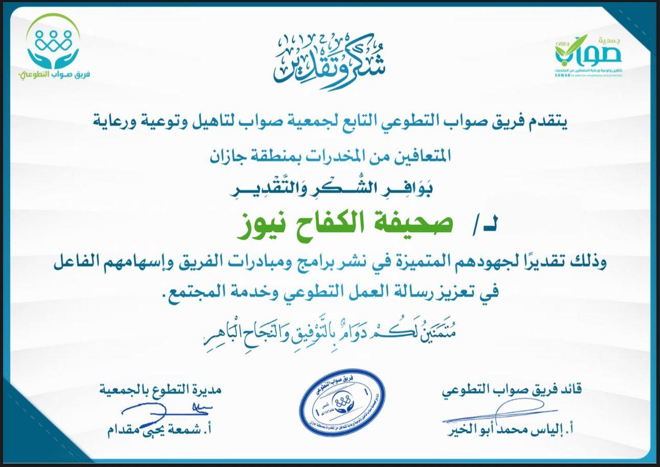 تم تكريم صحيفة الكفاح نيوز ،بثلاث شهادات شكر وتقدير بأسم صحيفة الكفاح نيوز وبأسم رئيس التحرير وبأسم محرر الصحيفة في مطقة جازان الأستاذ – عبدالعزيز قحل ،من فريق صواب التطوعي التابع لجمعية صواب لتأهيل وتوعية ورعاية المتعافين من المخدرات بمنطقة جازان ،وذلك تقديرا لجهود الصحيفة المتميز ،في نشر برامج ومبادرات الفريق ،وإسهامها الفاعل في تعزيز رسالة العمل التطوعي وخدمة المجتمع.
