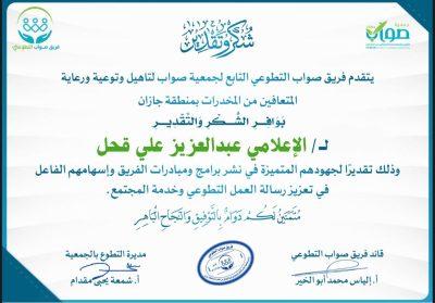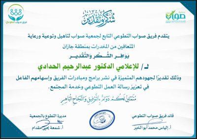 شكرا لقائد فريق صواب التطوعي الأستاذ – إلياس محمد أبو الخير والشكر موصول لمدير التطوع بالجمعية الأستاذة – شمعة يحي مقدام وللأستاذ – عبدالعزيز قحل.