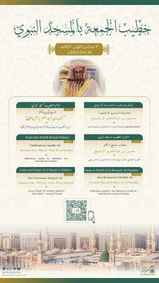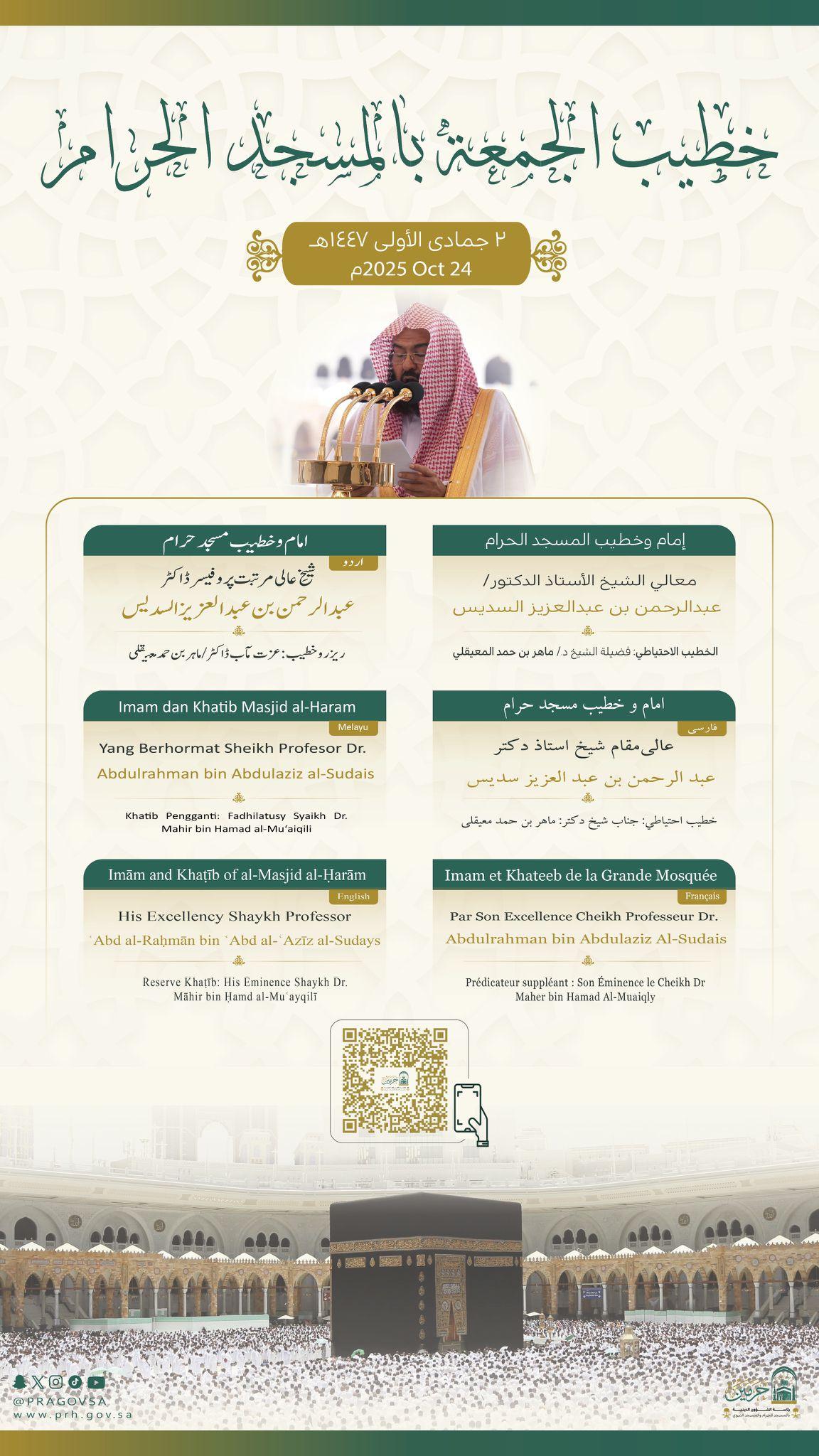 حددت رئاسة الشؤون الدينية بالمسجد الحرام والمسجد النبوي الشريف خطيبا الجمعة في الحرمين الشريفين ليوم بعد غد الجمعة 2 جمادى الأولى 1447هـ