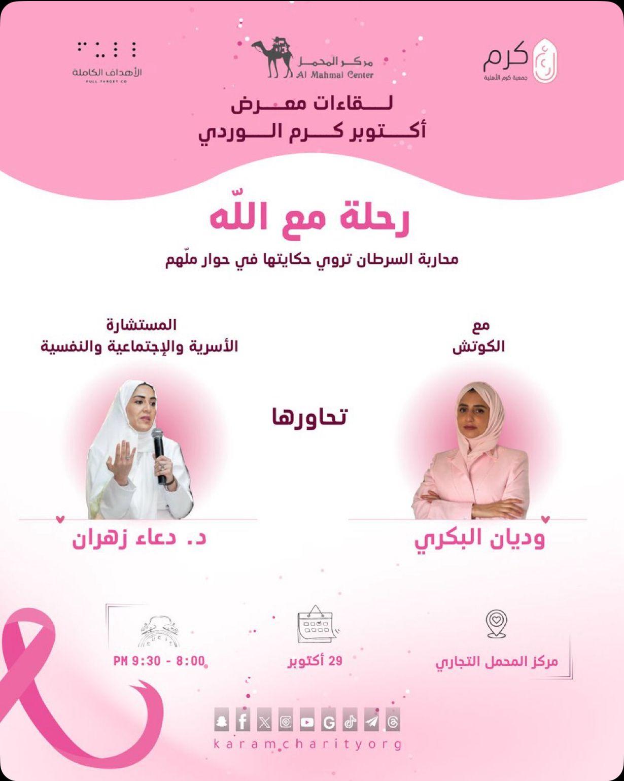 ضمن الأنشطة والبرامج والفعاليات والمبادرات التي تقوم بها جمعية كرم بجدة تقيم مساء غدا الأربعاء التاسع والعشرون من شهر أكتوبر الحالي لقاء بعنوان ( رحلة مع الله) حكاية مُلهمة ترويها محاربة السرطان في لقاء مؤثر – حيث يمثل الشهر العالمي للتوعية بسرطان الثدي تشارك وديان البكري بتجربتها في حوار عميق تديره المستشارة الأسرية والاجتماعية والنفسية الدكتورة دعاء زهران.