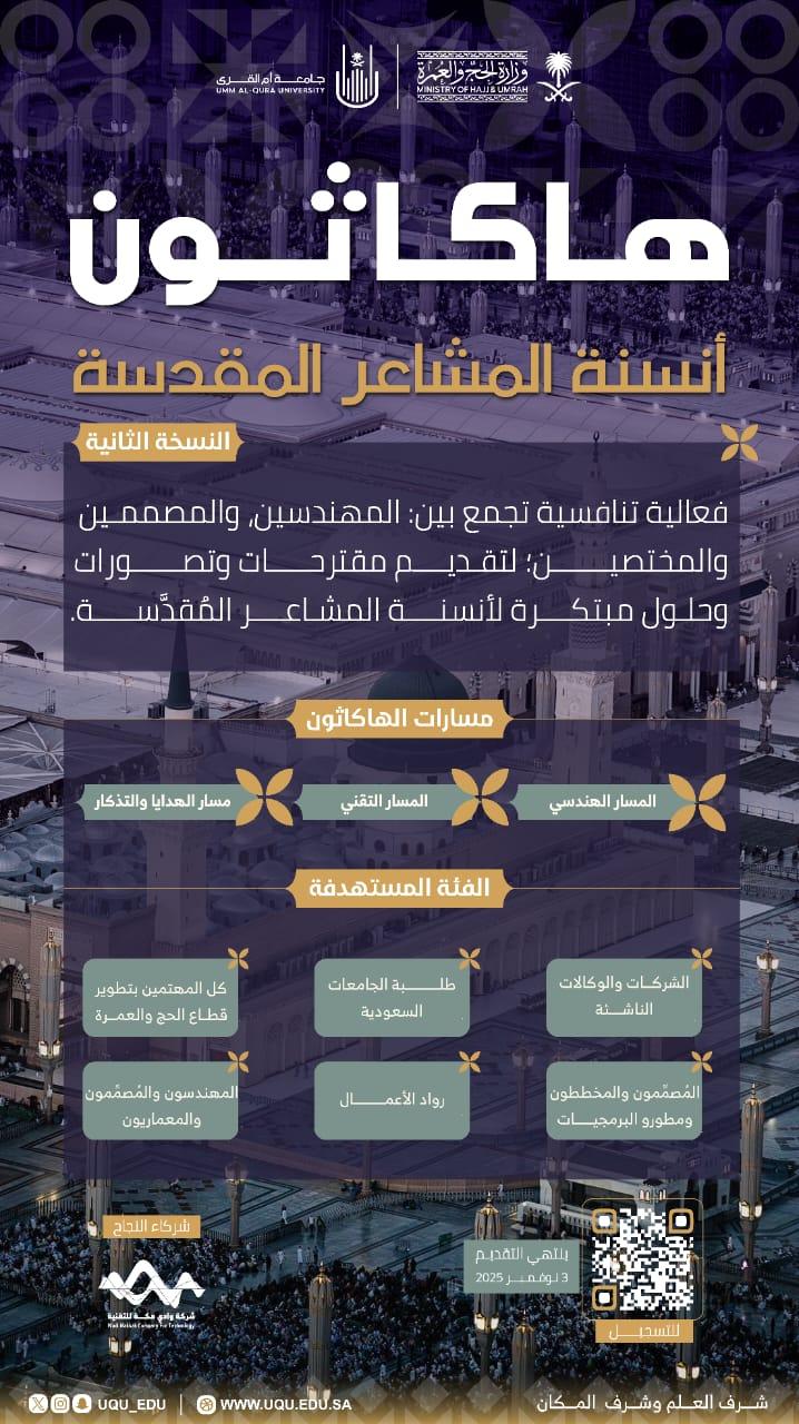 أطلقت جامعة أمِّ القرى بالتعاون مع وزارة الحج والعمرة النسخة الثانية من هاكاثون أنسنة المشاعر المقدسة، وهي فعالية تنافسية تجمع المهندسين والمصممين والمختصين لتقديم حلول هندسية وتقنية مبتكرة تسهم في: تعزيز أنسنة المشاعر المقدسة، وتطوير بيئات مستدامة تراعي احتياجات الإنسان، وتحافظ على التوازن مع البيئة؛ بما يحقق تجربة عمرانية مريحة وآمنة لضيوف الرحمن.