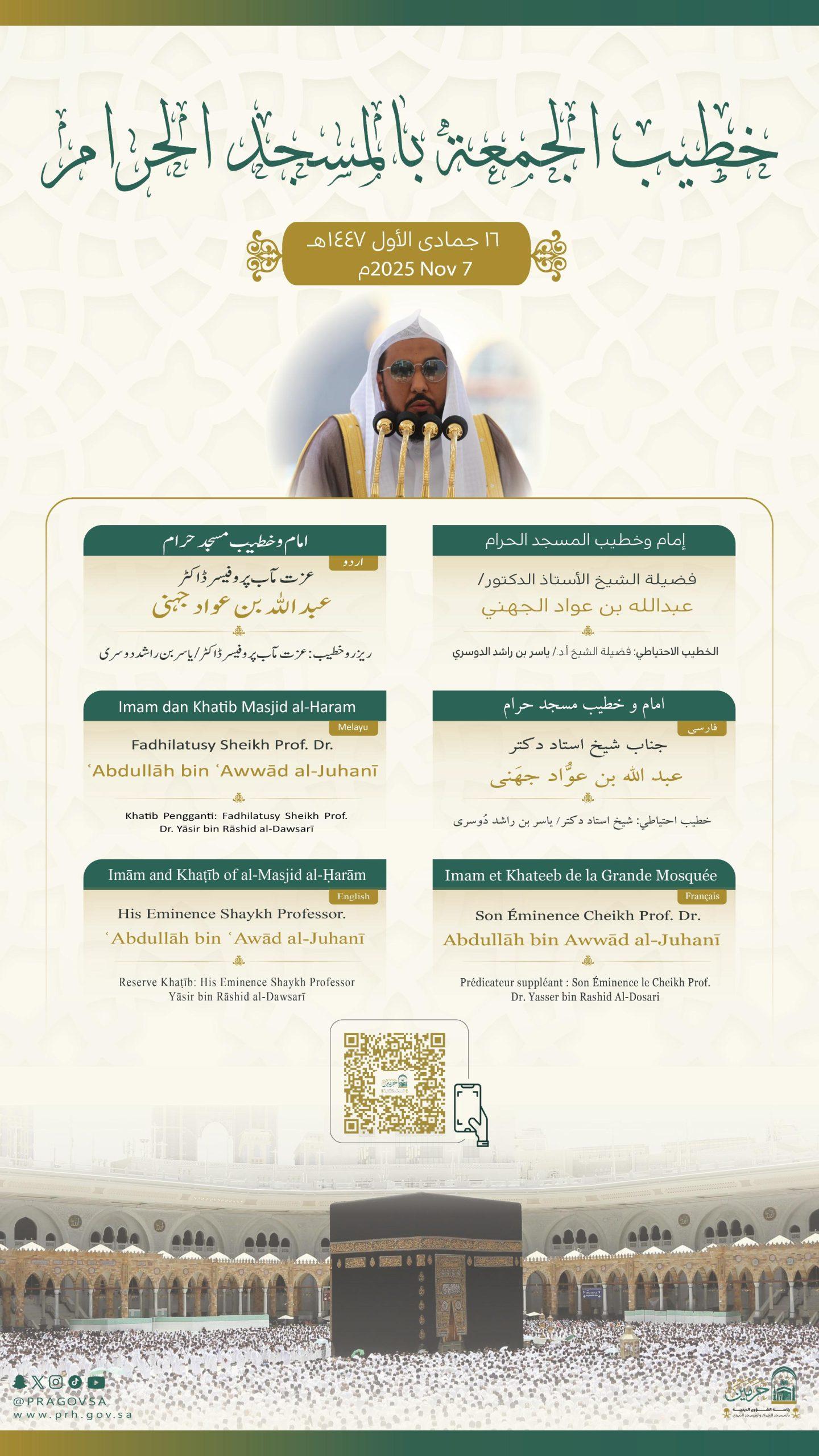 أوضحت رئاسة الشؤون الدينية بالمسجد الحرام والمسجد النبوي عن أسماء خطيبا وإماما يوم بعد غد الجمعة 16 جمادى الأولى 1447هـ، حيث سيتولى فضيلة الشيخ الدكتور عبدالله بن عواد الجهني إمامة المصلين وإلقاء خطبة الجمعة في المسجد الحرام.